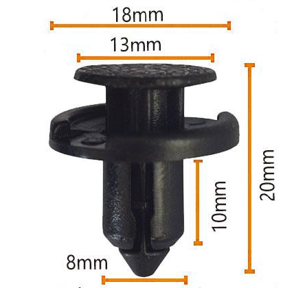לקליפ המכונית קוטר עליון מתחדד של 18 מ"מ, קוטר תחתון של 13 מ"מ, אורך של 20 מ"מ ועובי צד של 8 מ"מ.